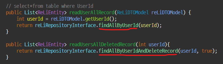 JpaRepository를 상속받는 인터페이스에 메소드를 정의해주어야 한다.