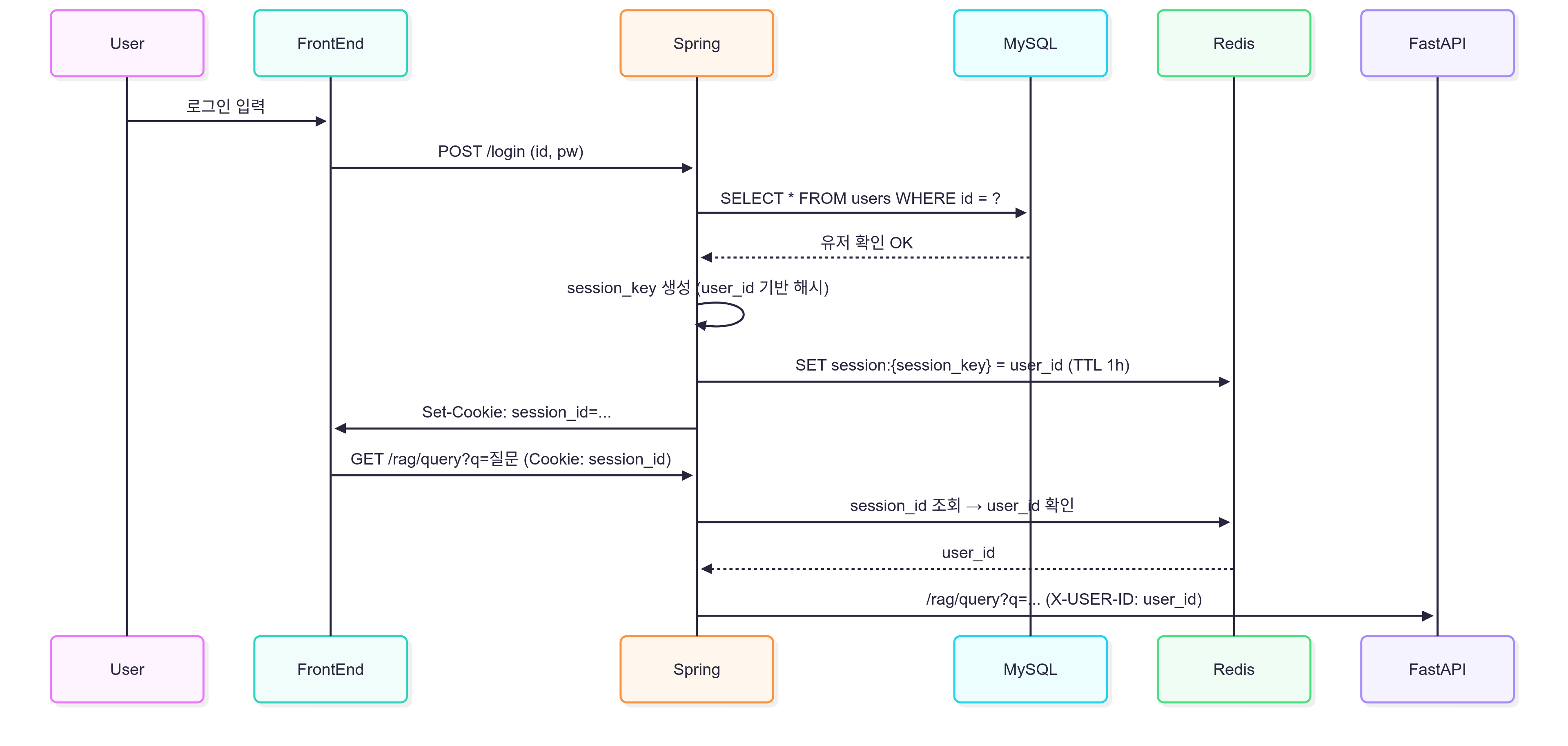단순 react - FastAPI 연결을 했다가는 예상치 못한 무수한 요청에 무의미한 API 호출로 지갑이 거덜날까 무서워, Spring으로 미들웨어를 구축하며, 세션 베이스 사용자 인증 로직도 추가하기로 했다. 물론 id/password는 MySql 로 관리를 하려고 한다.
