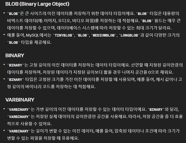 이러한 리스크를 지기보다는 차라리 애초에 0과 1로 이루어진 파일들인데 그 0과 1로 된걸 저장하자! 로 시작해서 이 이진 데이터를 저장하기 위해, 관리하기 쉽게 하기 위해 DB에 이진 데이터 타입이 만들어 진게 아닐까 싶다.