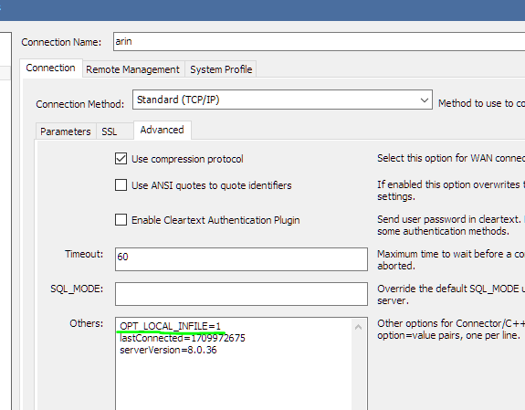 콘솔에서 아무리 local infile =1 을 줘도 workbench에는 적용이 안되는걸 보니 더욱 열이 찼다.