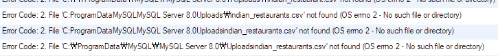 첫번쨰로 load data 쿼리문을 한번에 복사 붙여넣기 해서 syntax error가 발생했고