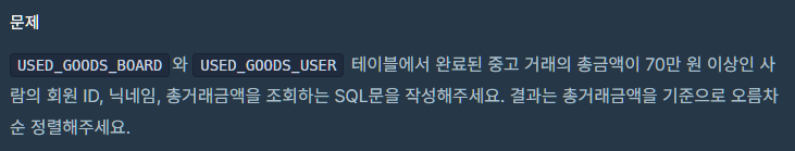 그룹화 된 user, nickname 의 총 거래금액이 70만원 이상이어야 하기 때문에 where절이 아닌 having 절에 조건문 사용했다.