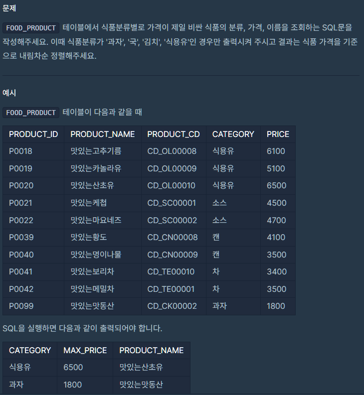 with절의 최대 price를 가지고 카테고리가 같은 레코드의 상품 이름을 food_product 테이블에서 추출했다.